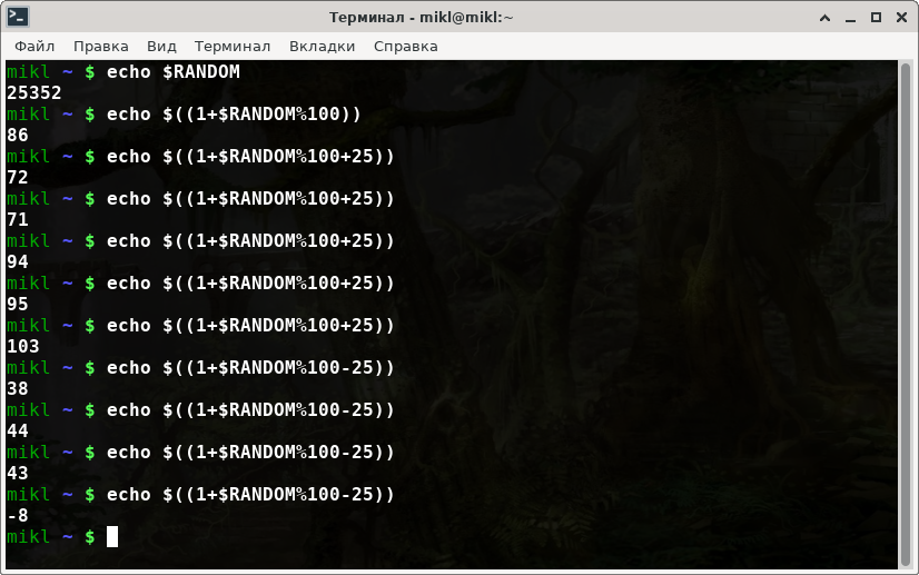 $ echo $((0+$RANDOM%100)) # 0 - число ОТ, 100 - число ДО