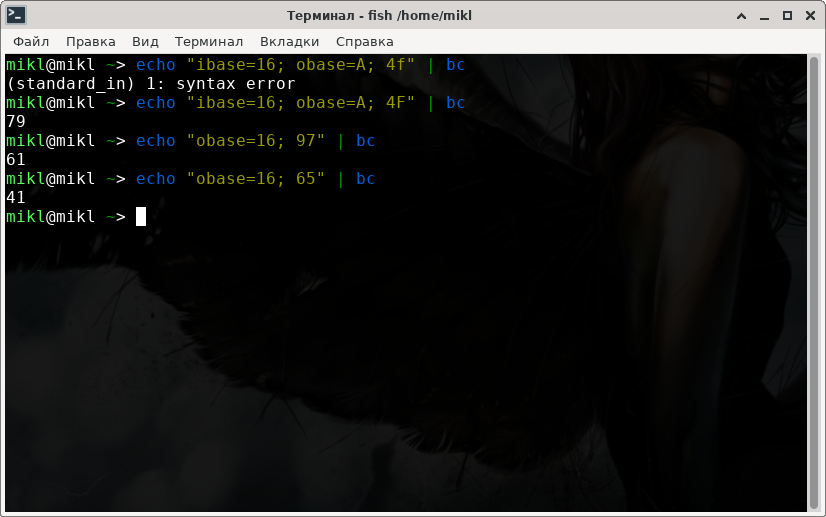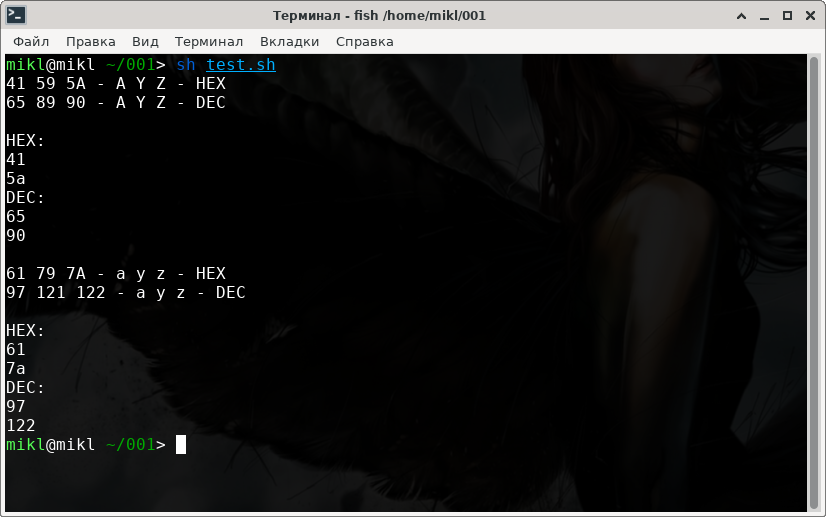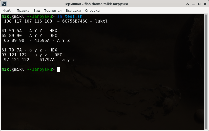 #!/bin/bash echo -e -n "41 59 5A - A Y Z - HEX\n65 89 90 - A Y Z - DEC\n" echo "" echo "HEX:" echo -e -n "A" | xxd -p echo -e -n "Z" | xxd -p echo "DEC:" echo "ibase=16;obase=A;41" | bc echo "ibase=16;obase=A;5A" | bc echo "" echo -e -n "61 79 7A - a y z - HEX\n97 121 122 - a y z - DEC\n" echo "" echo "HEX:" echo -e -n "a" | xxd -p echo -e -n "z" | xxd -p echo "DEC:" echo "ibase=16;obase=A;61" | bc echo "ibase=16;obase=A;7A" | bc