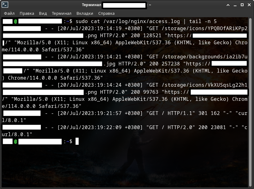 В последних 2 строках GET-запросы происходили не через браузер и с помощью утилиты Curl. При этом видим также и версию этой утилиты.