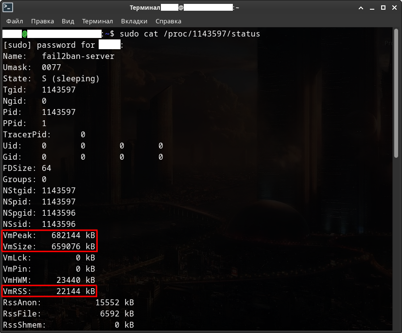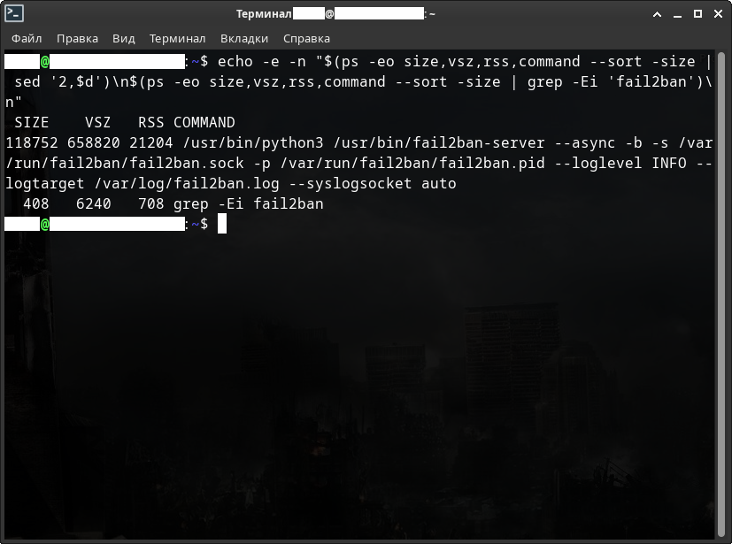 А теперь давайте посмотрим на работу скрипта черного списка «py-blacklist.py» в сочетании со всеми указанными фильтрами, действиями и правилами для Fail2ban-а на реальном VPS-сервере. Некоторые строки закоментированы в целях безопасности. Из журнала событий скрипта отображены только последние 5 строк, иначе он заполнит весь экран примера.
