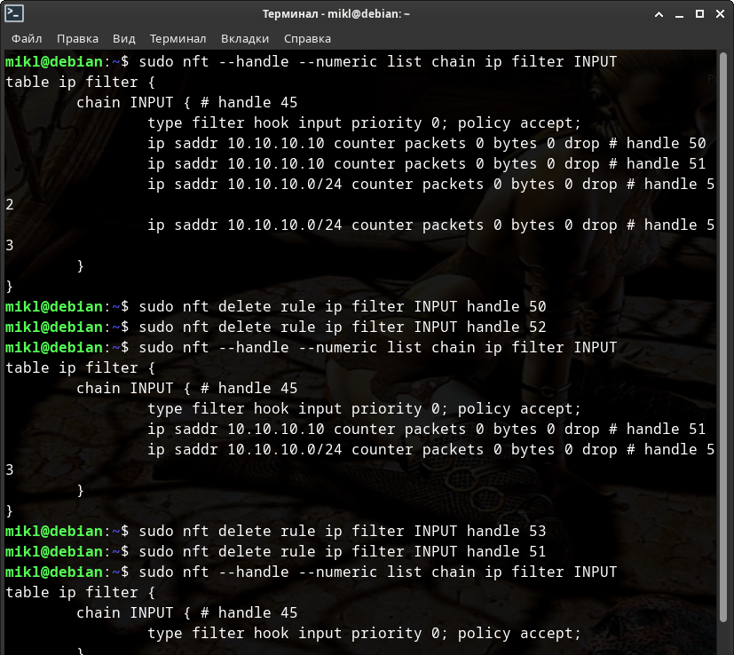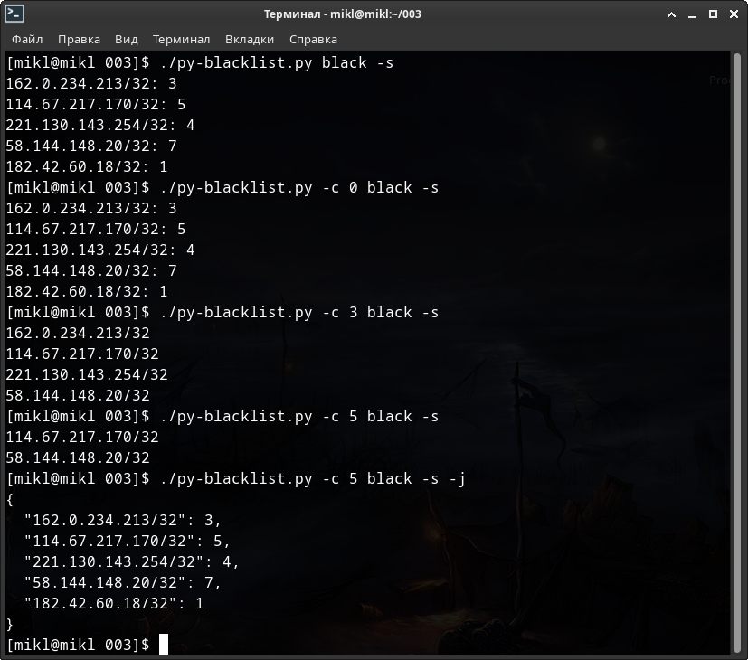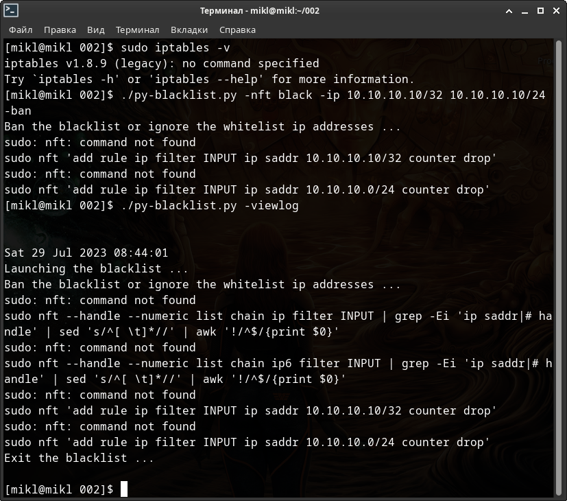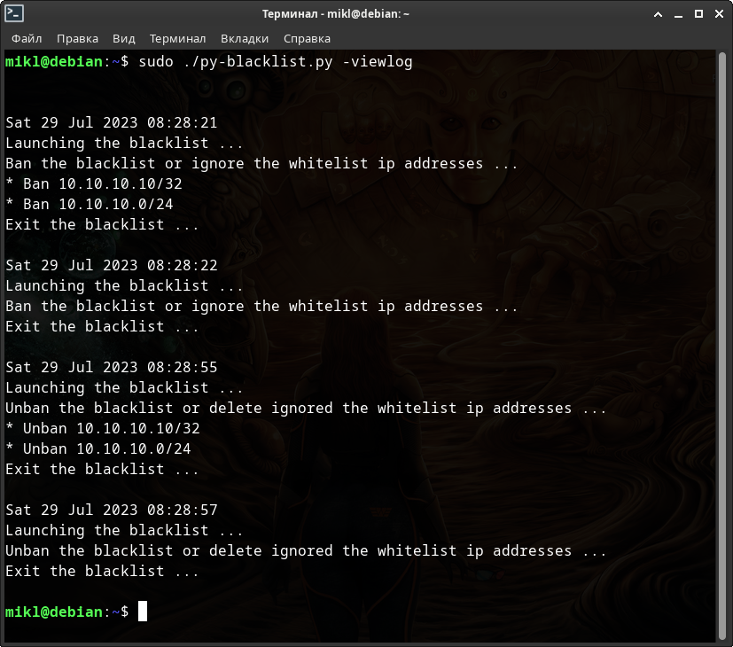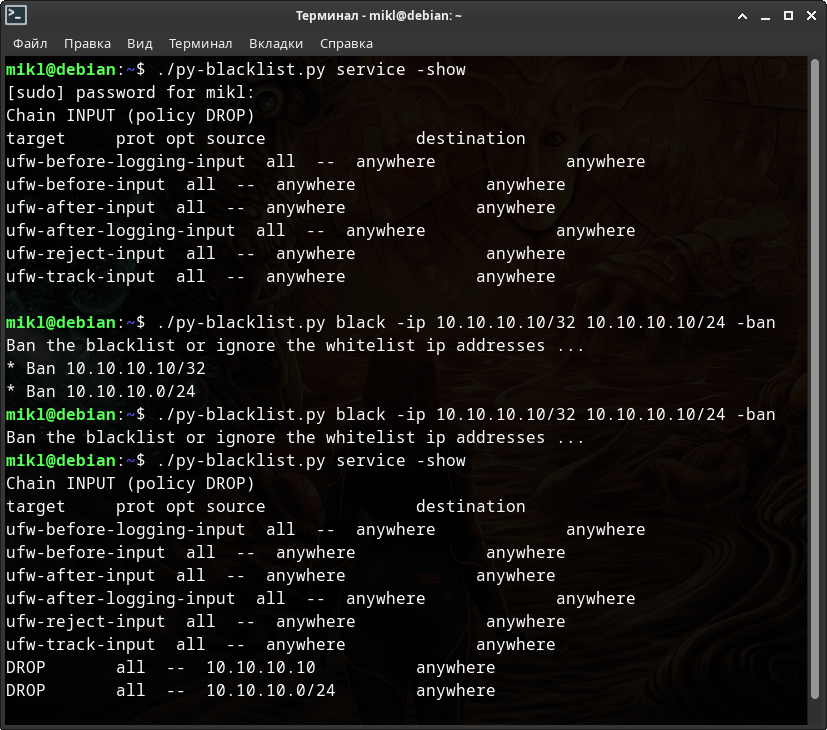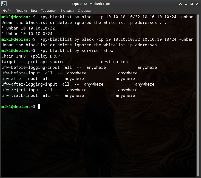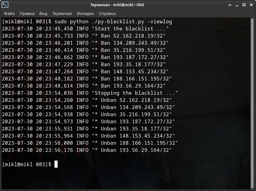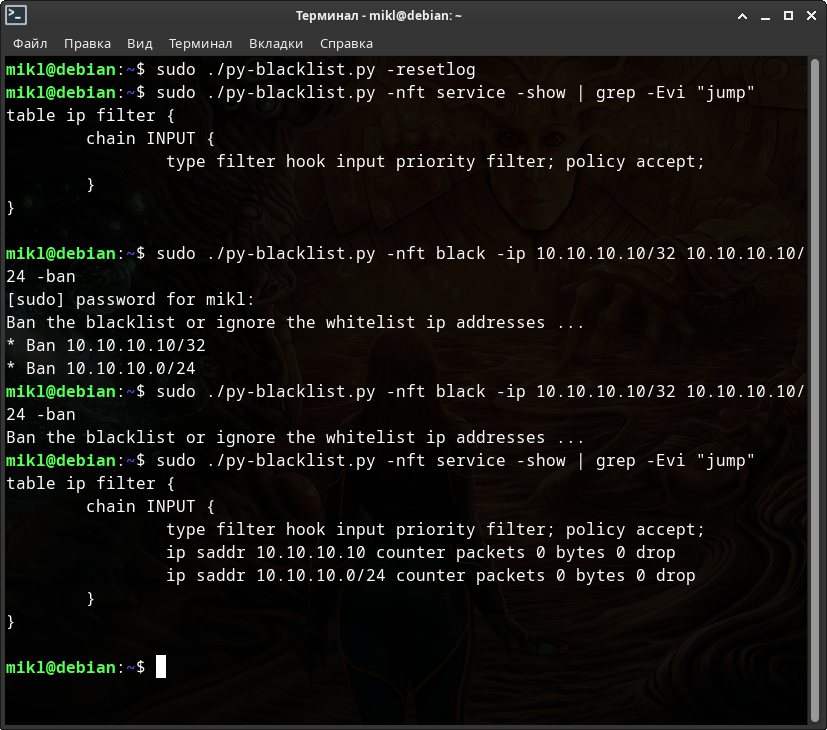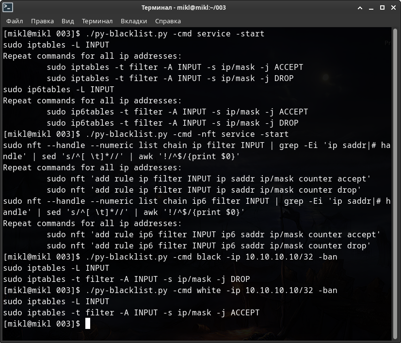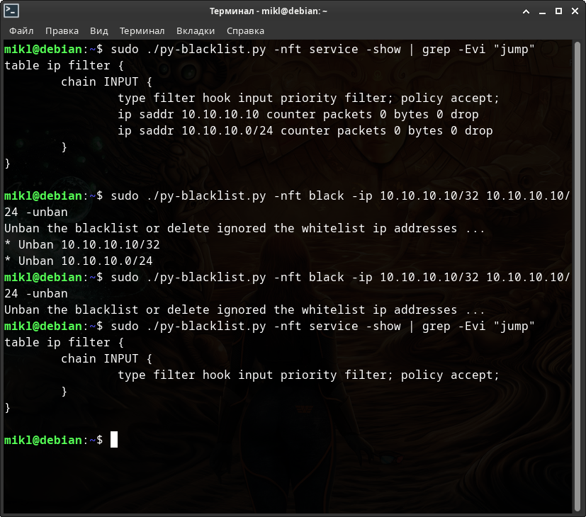 # Для NFTABLES $ sudo ./py-blacklist.py -nft -run -fine -c 3 systemd -delete # и для IP(6)TABLES соответственно $ sudo ./py-blacklist.py -c 3 systemd -delete